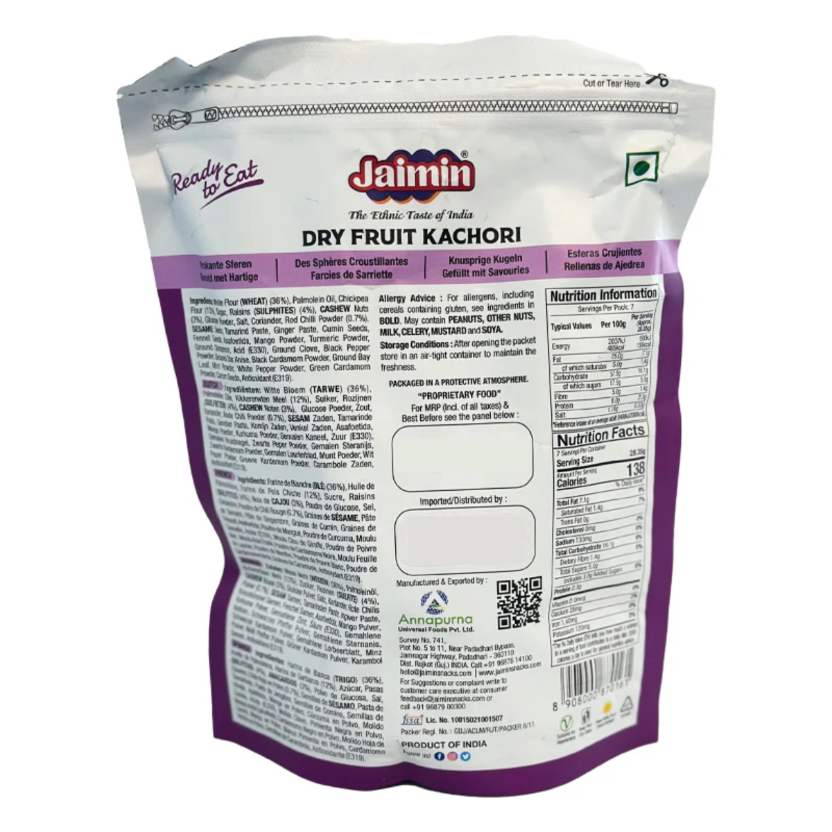 Jaimin Dry Fruit Kachori is a premium savoury snack featuring a crispy outer shell filled with a rich blend of dry fruits and aromatic spices. It delivers a unique combination of crunchy texture with a mildly sweet and spiced filling.