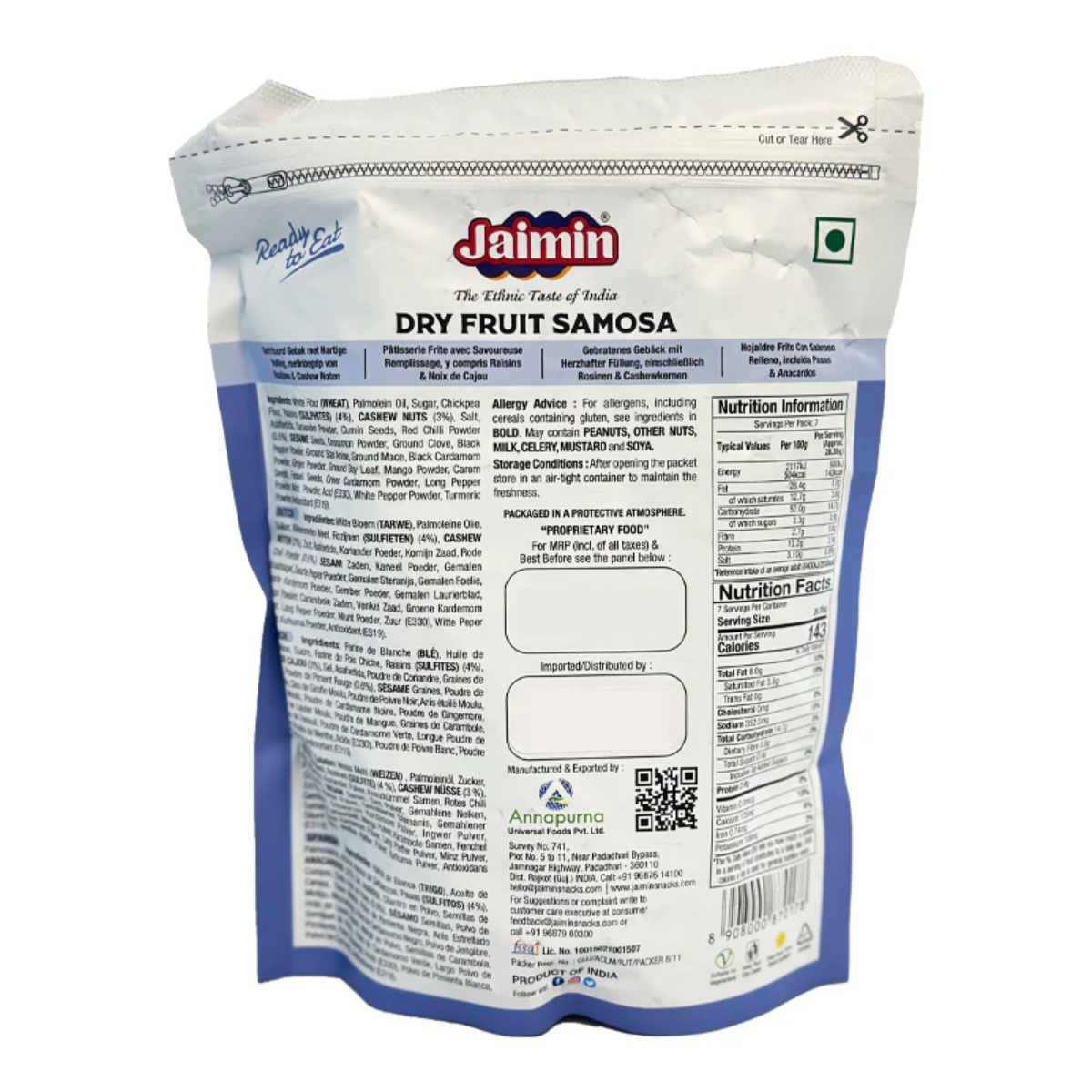Jaimin Dry Fruit Samosa is a delicious twist on the traditional Indian samosa, featuring a crispy golden pastry shell filled with a rich blend of dry fruits, nuts, and aromatic spices. These bitesized samosas offer a unique balance of sweet, tangy, and mildly spicy flavours, making them a delightful snack for any time of the day.